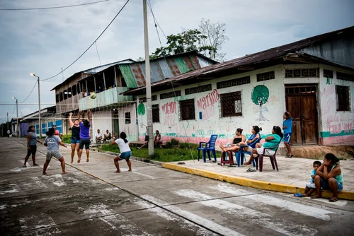 Children play in the back of a classroom destroyed by a bomb in Kanyaruchinya, DRC. (2013)